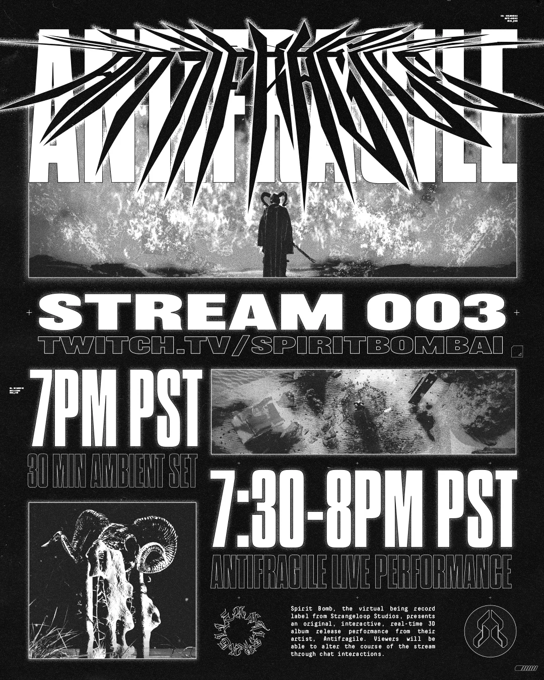 Live Stream 003 coincides with the release of ABRAXAS [EP] by Antifragile, whose music is made in collaboration with the duo Eye Contakt (Autry Fulbright and Mark Pagly). The stream will open with an ambient set curated by Spirit Bomb collaborator and Brainfeeder artist PBDY, and conclude with a new performance by Antifragile.